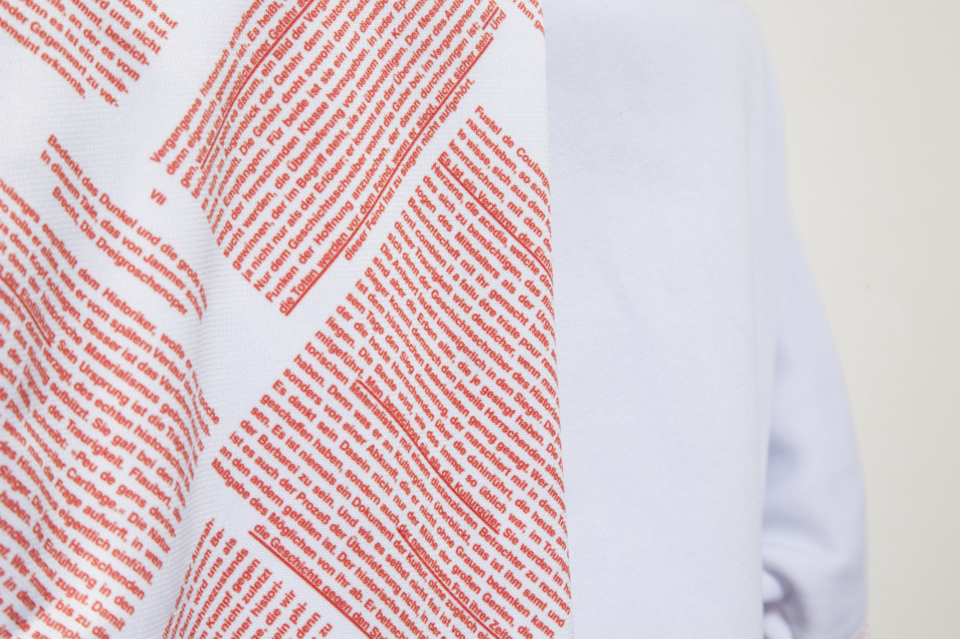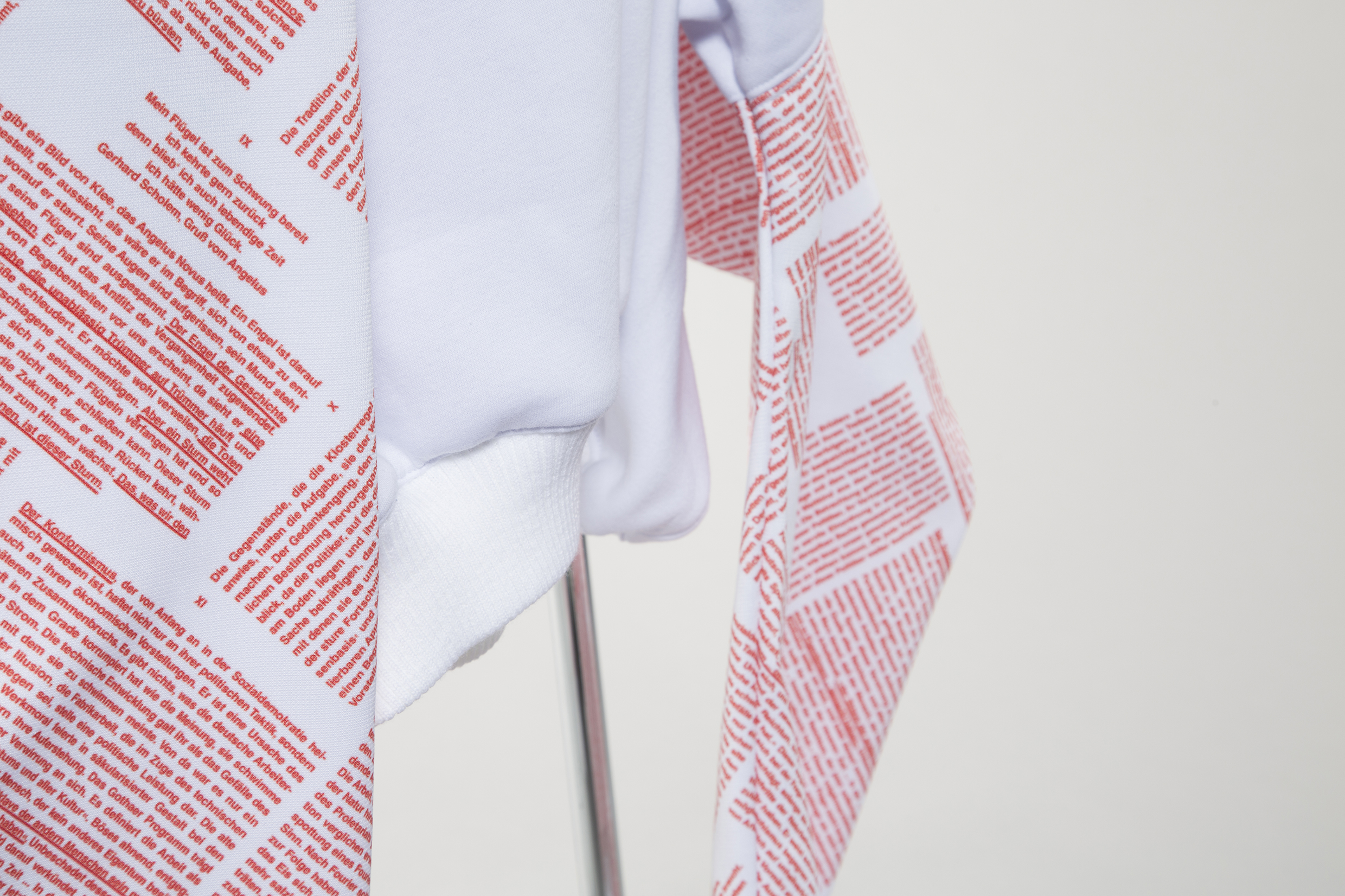 Der Sweater zitiert nicht nur die Vergangenheit, er greift gleich Benjamins (historischen) Text „Über den Begriff der Geschichte“ auf. Aus der Nähe betrachtet ist der Text auf dem Sweater komplett lesbar. Das Rot ist die Farbe des Klassenkampfs. Die langen Ärmel spielen auf zeitgenössische Mode an, auf den „Oversize“-Look, und überspitzen ihn. Den Oversize-Look gibt es seit den 1920er Jahren, in den 1980er- und 1990er-Jahren erlebte er dank der Hip-Hop-Kultur dann sein absolutes Hoch. Der Sweater blickt also doppelt zurück, greift einen vorhandenen Stil auf, und ist gleichzeitig ein zeitgenössisches Stück Mode, das, freilich, im nächsten Moment schon wieder passé sein wird, nur um wieder aufzutauchen.